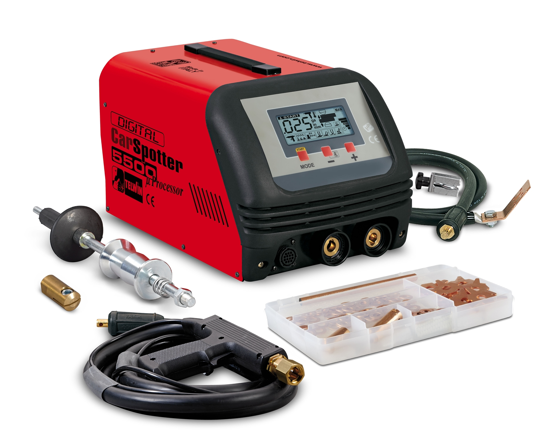 Multifunkční mikroprocesorová bodovací svářečka Telwin Digital Car Spotter 5500. Pro bodování plechů, nýtů, šroubů, hřebíků, podložek, drátových vlnovců, žíhaní vytahovaných plechů. Volba režimů pro různé bodovací nástroje, volba režimu pro bodování různých tlouštěk plechů, volba režimu žíhání. Napájení 230 V, pro plechy max. 2x1,5 mm